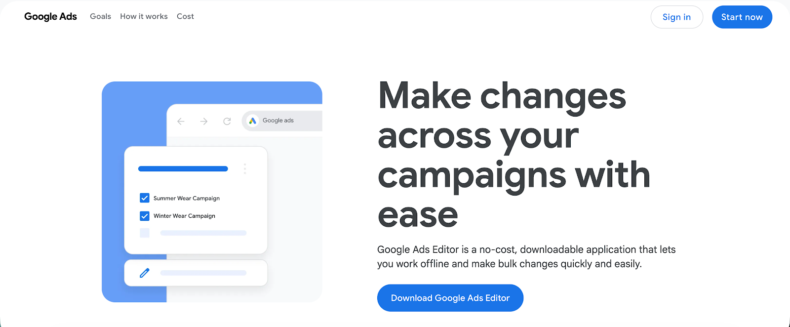 Google Ads Editor is a free desktop tool from Google Ads that lets you manage campaigns offline and make large scale changes quickly. It’s widely used by PPC specialists and agencies handling multiple accounts or high volume campaigns.